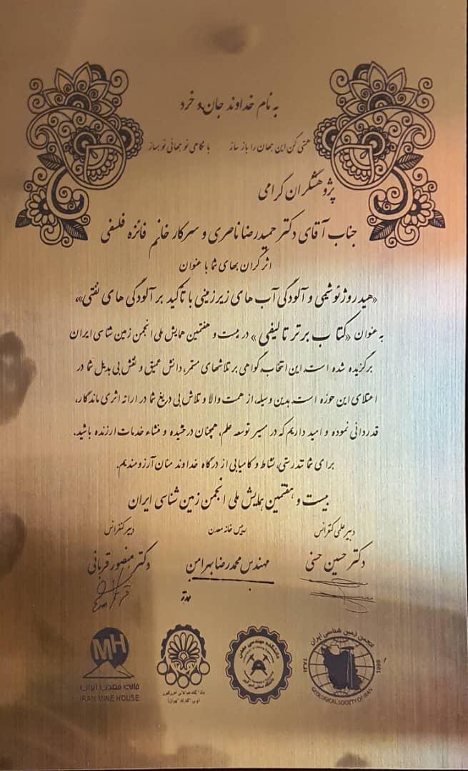 انتخاب کتاب "هیدروژئوشیمی و آلودگی آب های زیرزمینی با تاکید بر آلودگی های نفتی" به عنوان کتاب برتر اولین کنفرانس ملی هیدروژیولوژی ایران