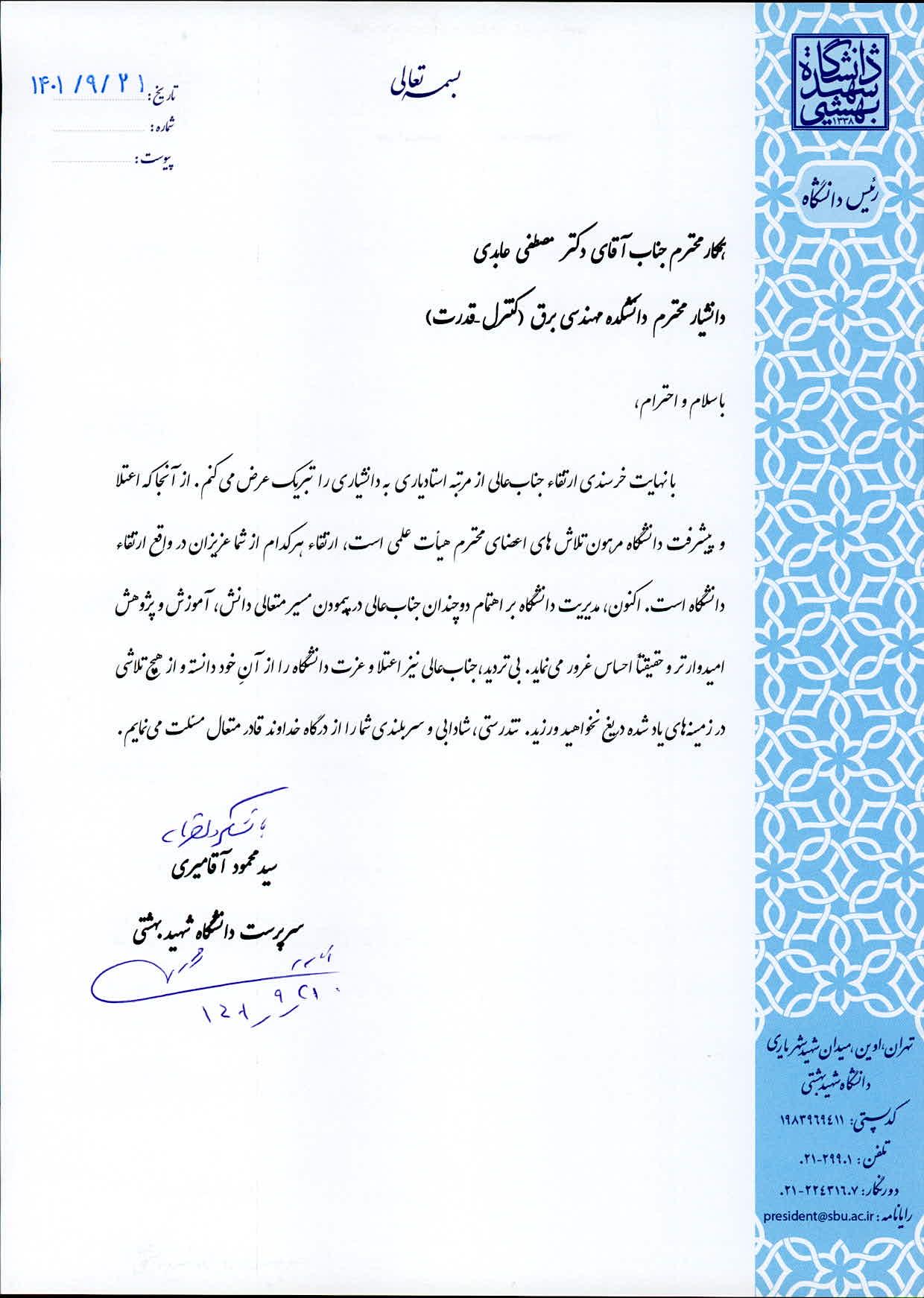 دکتر سید محمود آقامیری، رئیس دانشگاه شهید بهشتی، با ارسال پیامی ارتقاء مرتبه علمی دکتر مصطفی عابدی، عضو هیات علمی دانشکده مهندسی برق(کنترل-قدرت) را از استادیاری به دانشیاری تبریک گفت. متن پیام به شرح زیر است: