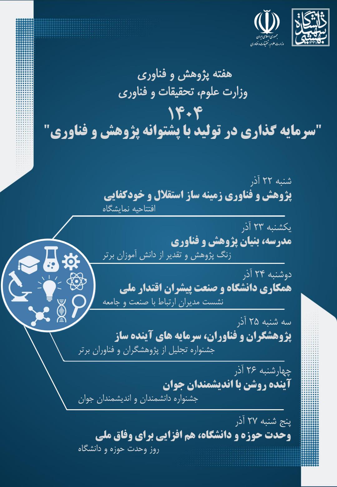 به مناسبت فرا رسیدن هفته پژوهش و فناوری سال ۱۴۰۴، وزارت علوم، تحقیقات و فناوری شعار محوری هفته پژوهش سال ۱۴۰۴ را «سرمایه‌گذاری در تولید با پشتوانه پژوهش و فناوری» اعلام کرد. بر اساس برنامه ملی، روزهای این هفته از ۲۲ تا ۲۷ آذر با عناوین موضوعی مختلف از جمله «پژوهش و فناوری زمینه‌ساز استقلال و خودکفایی»، «مدرسه؛ بنیان پژوهش و فناوری»، «همکاری دانشگاه و صنعت؛ پیشران اقتدار ملی»، «پژوهشگران و فناوران؛ سرمایه‌های آینده‌ساز»، «آینده روشن با اندیشمندان جوان» و «وحدت حوزه و دانشگاه؛ هم‌افزایی برای وفاق ملی» نام‌گذاری شده‌اند. دانشگاه نیز همسو با این رویکرد ملی، مجموعه‌ای از برنامه‌ها، نشست‌ها و جشنواره‌های علمی را با هدف تقویت نقش پژوهش در حل مسائل و گسترش فرهنگ نوآوری برگزار خواهد شد.